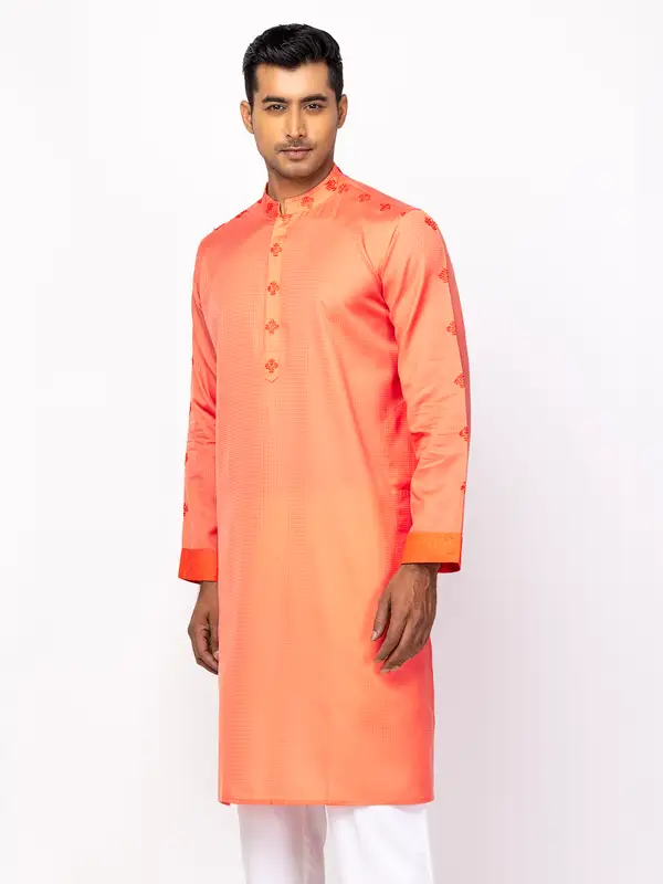 Peach texture printed cotton panjabi with orange embroidery. Features in-seam side pockets.